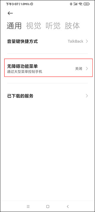 2、点击“辅助功能权限”后,找到“无障碍功能菜单”,是默认关闭的,需要开启。