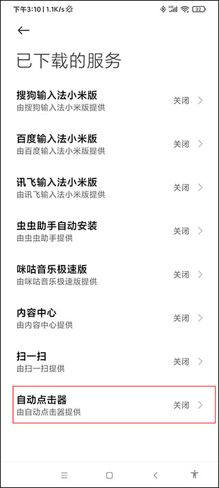 5、找到“自动点击器”,也是默认关闭的,需要开启。