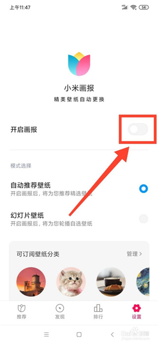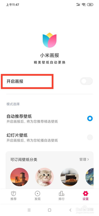 4、找到“开启画报”后,点击旁边的“开启键”画报就开启成功了。