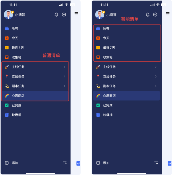 * 智能清单:根据一定条件智能筛选显示相应任务的清单。(如:所有、今天、明天、最近7天...)