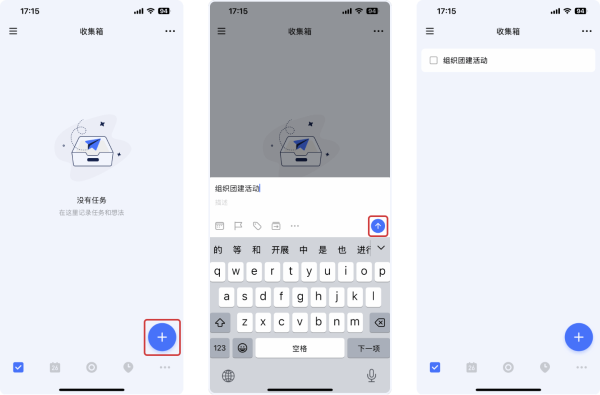 点击随处可见的「+」,输入任务后,点击「完成」图标,即可轻松创建任务。