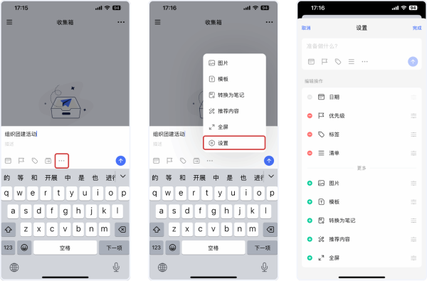 添加任务时底部功能栏的顺序支持自定义,点击「...」-「设置」,快速设置你的常用功能。