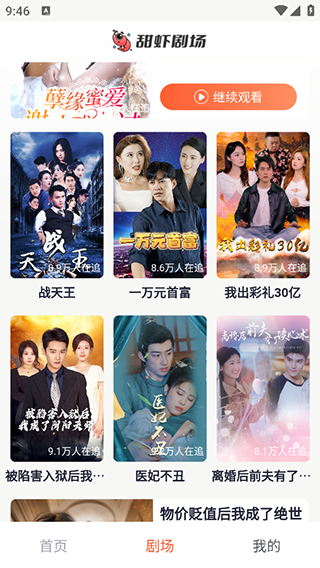 甜虾剧场app是一款专注于为用户提供非凡追剧体验的应用软件,以短剧为主要内容,涵盖了战神、甜宠、悬疑等多种类型,无论是热血激昂的战争剧,还是甜蜜浪漫的言情剧,亦或是扣人心弦的悬疑剧,你都能在甜虾剧场找到,每部短剧都经过精心策划和制作,故事情节紧凑,节奏明快,让人看得过瘾。所有短剧都是由专业团队匠心打造,无论是剧本、演员、拍摄手法还是后期制作,都力求达到最高标准。此外,甜虾剧场还提供了用户友好的界面和便捷的操作体验,以及丰富的社交功能,让用户可以与其他剧迷交流心得,分享观影体验,增加了追剧的趣味性和互动性,喜欢看短剧的朋友千万不要错过哦~
