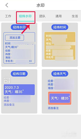 2、接着在水印类别中,点击类型经纬度,在选择具体类型。