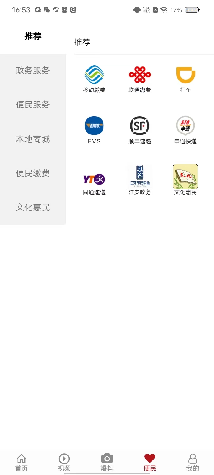4、在【便民】页面,给用户提供了很多服务,比如说移动缴费、打车、寄快递、本地商城等,对于用户使用来说非常方便。