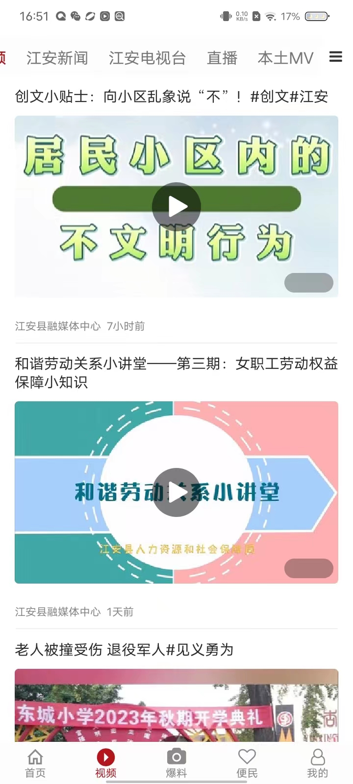 2、在【视频】页面,可以查看江安新闻、江安电视台、直播、本土MV等视频;