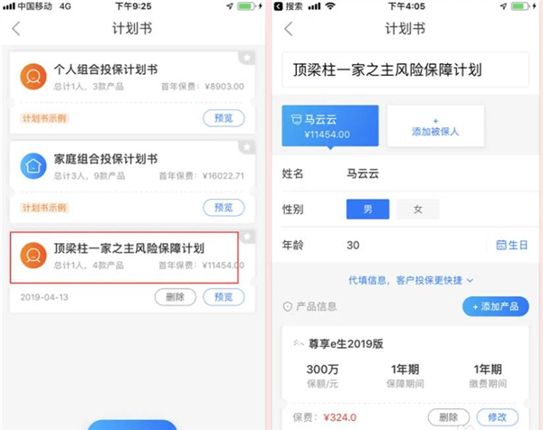 在编辑页面上,各位i云保个人保险代理人需要填写计划书名称、被保人姓名,以及给被保人准备的产品组合。计划书支持给多个被保人设置不同的保险组合计划。