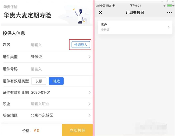 帮助客户完成健康告知之后,就可以进入投保页面,支持点击 “快速导入” 快速填写入在计划书阶段代录的客户信息。与此同时,在计划书中投保的产品也会进入到 app 的订单列表中。此外,同一份计划书,转发出去后,支持不同客户直接打开投保,且相互之间互不影响,可以放心地将计划书挂在公众号及其他互联网场景中展业。