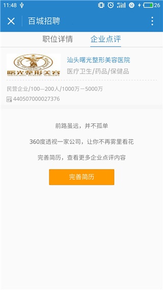3、可以在企业点评中看到公司的规模,还可以完善简历;