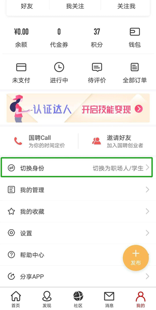 职场人、学生、创业者或导师三者身份可在个人主页中进行切换。
