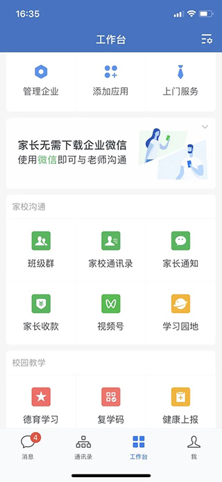 老师可使用「家长通知」,向家长发布作业、校园事件通知,家长在微信「通讯录-学校通知」中接收通知的同时,还可直接联系相关老师、发起会话。