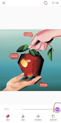 4、在此界面中,默认选择的是“擦除”功能。接着就用手指在图片上的水印处进行涂画。