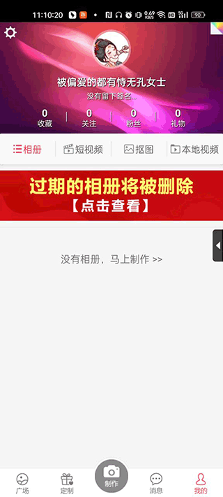 2、点击右下角我的,我的相册和以往作品都在这个栏目,点击中间的相册就可以解锁相册了。