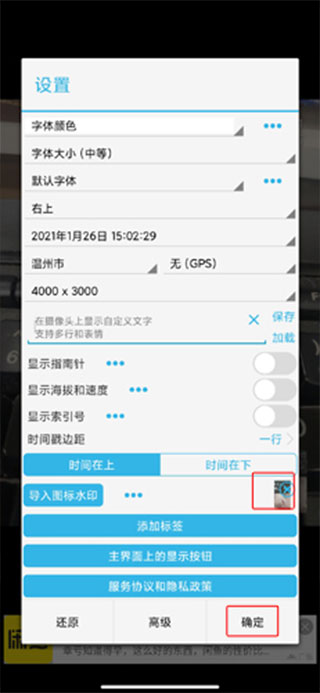 -在拍照或者录像时添加当前时间和位置。可以任意地设置字体的位置,改变字体、字体颜色、大小及透明度。
