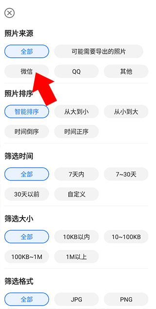 5、选择照片来源,如果是微信保存的图片那么选择微信来源即可,qq则选择qq即可,如果图片数量过多还可使用时间筛选功能,进一步帮助我们过滤无用结果