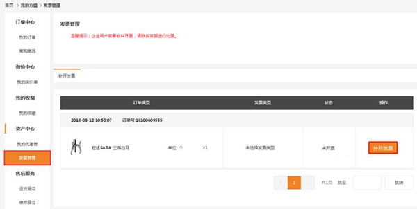 1、申请补开发票,点击“资产中心>发票管理”按钮,可以看到可以补开发票的订单。
