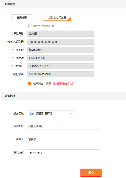 客户可选择开具增值税普通发票(企业/个人)和增值税专用发票。如选择增值税专用发票,则开票信息为签约账户入驻时提供的信息,如需修改请联系平台客服。