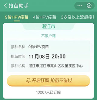 2、预约开放前,点击“开启订阅”可收到抢苗通知。疫苗开放预约时订阅按钮将变为预约入口,点击立即预约。