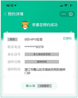 4、预约成功后将获得确认码和确认短信,之后请携带身份证(成人),按预约时间准时前往接种点接种。