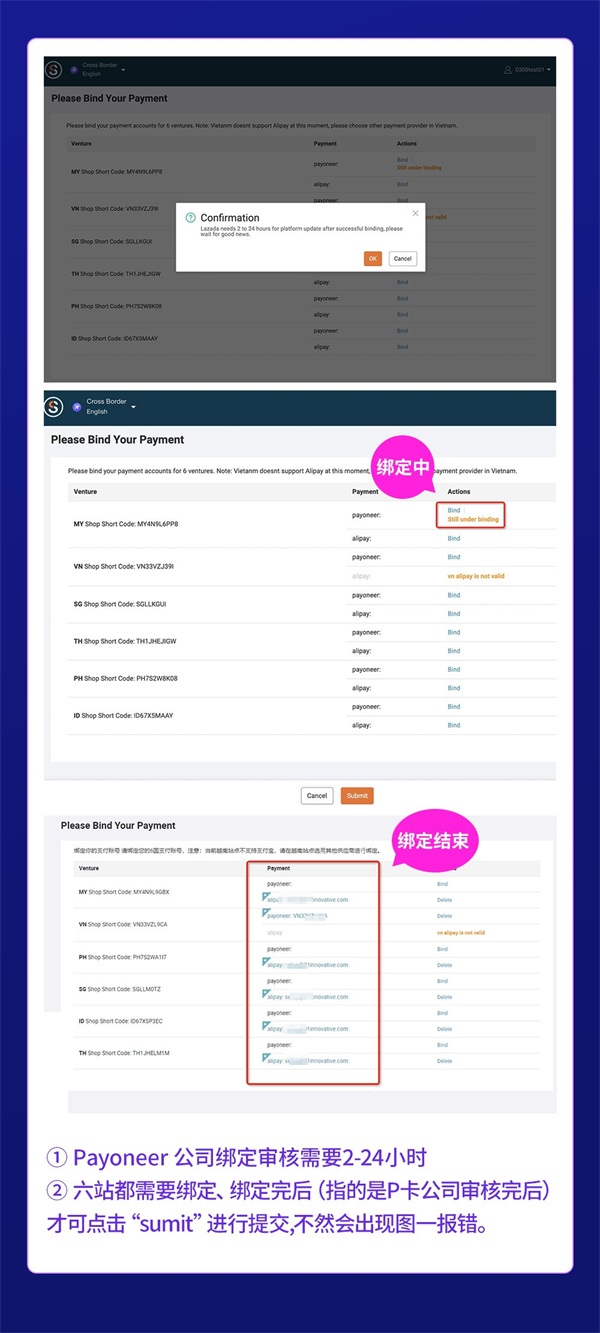 A8:对,首次开店需6国全部绑定。除VN外,其他5国Alipay和Payoneer均可选择性绑定,VN必须绑定P卡。
