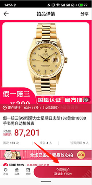 2、点击“立即参拍”选项,然后缴纳保证金即可参加拍卖。
