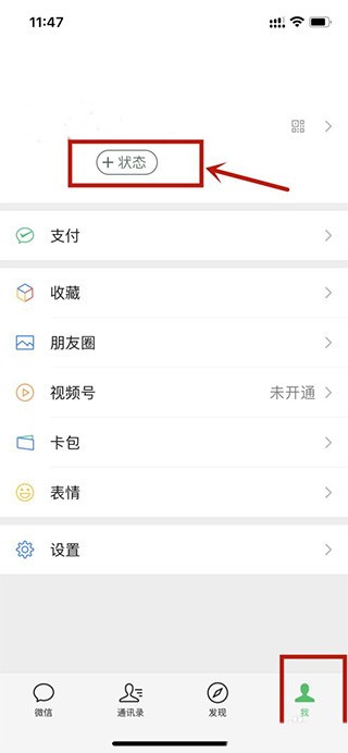 1、首先打开微信8.0版本,点击“我的”,点击头像下方的“+状态”