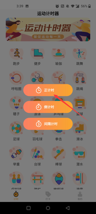 2、我们点击“跑步”,就会出现正计时、倒计时、间隔计时,看自己需求。