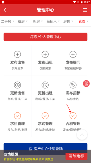 1、选择软件最后一个模块【管理中心】,点击“合租管理”功能选项。