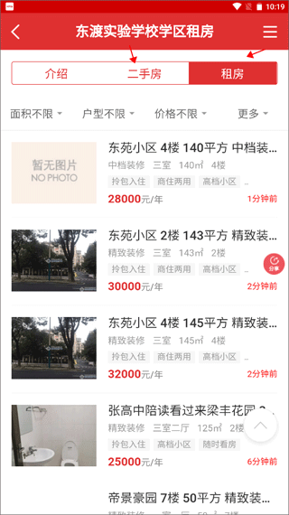 4、在这里你可以看到很多的二手房和租房资源,根据你自身的需要来选择其中一套房。
