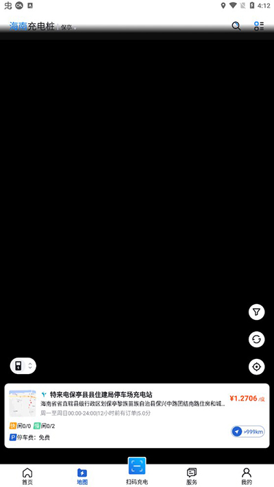 打开应用后,您将看到主页面上方有一排功能图标;这些功能包括“地图”(显示附近的充电桩和充电站)、“服务”(提供各种实用信息,如城市充电桩分布、资讯和常见问题解答)、“扫码充电”(使用手机扫描充电桩上的二维码进行充电)和“我的”(管理个人账户信息和支付方式);