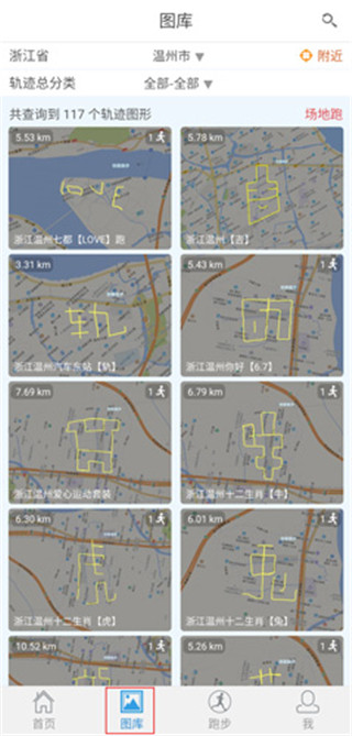2、图库页面:带来各个省份各个地区的跑步轨迹;