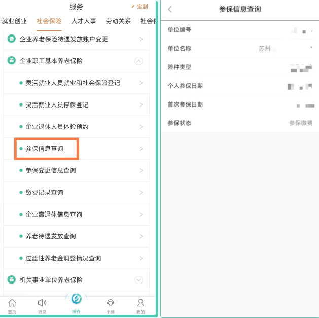 3.点击“参保信息查询”,即可查询本人参保单位名称、险种类型、参保状态等信息。