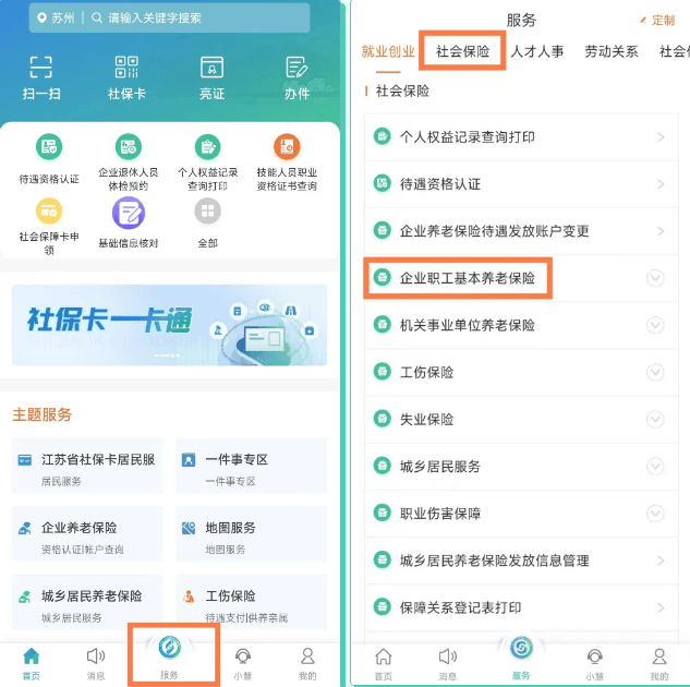 2.点击中间“服务”模块,选择“社会保险”,点击“企业职工基本养老保险”。