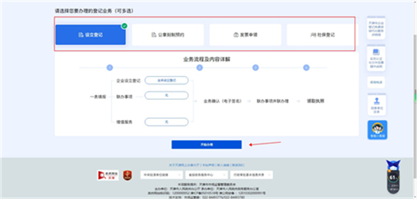 8、在选择办理类型后,根据实际需求选择相应的登记业务;选择完成后,点击开始办理按钮;