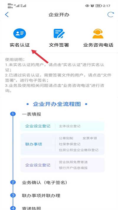 2、在企业开办页面,点击实名认证按钮以完成认证;