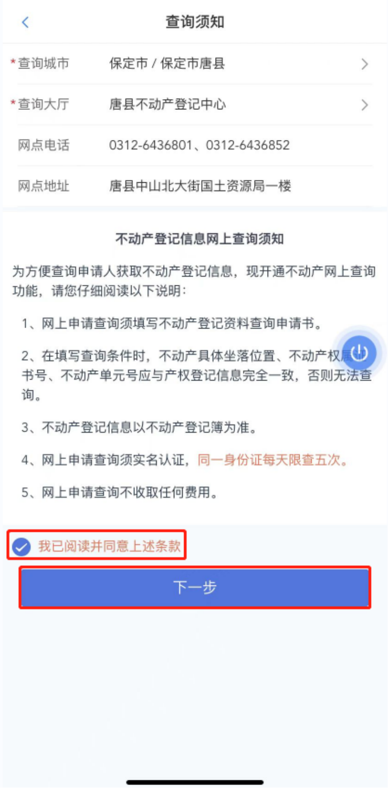 5、阅读并同意《不动产登记信息网上查询须知》,点击“下一步”;