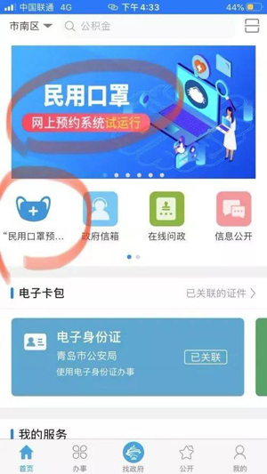 2、2月6日17:00—21:00、2月7日8:00—20:00,市民登陆“青岛政务网”微信公众号、“支付宝城市服务”青岛站、青岛政务通APP进入“口罩预约”应用,如实准确填写身份证号码、姓名、手机号码等信息后,选择就近的门店,每次限购10只,每只2元,预约成功的系统自动发送短信确认,并根据预约时间自动分配取货时段。