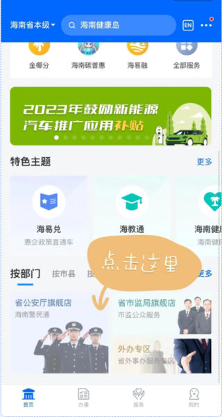 1.进入海易办平台首页,下滑点击“省公安厅旗舰店”,进入“海南警民通”服务。