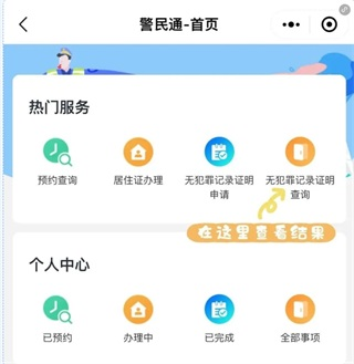 5.回到警民通首页点击“无犯罪记录查询”,即可查看结果。