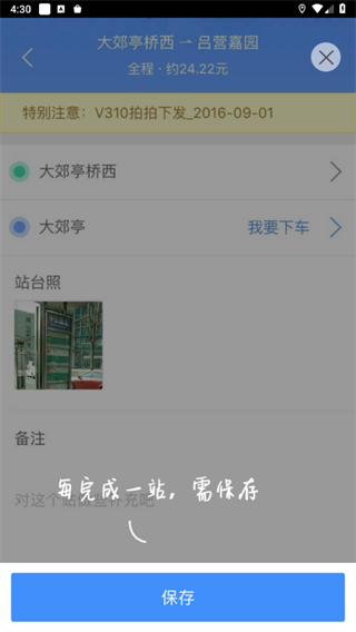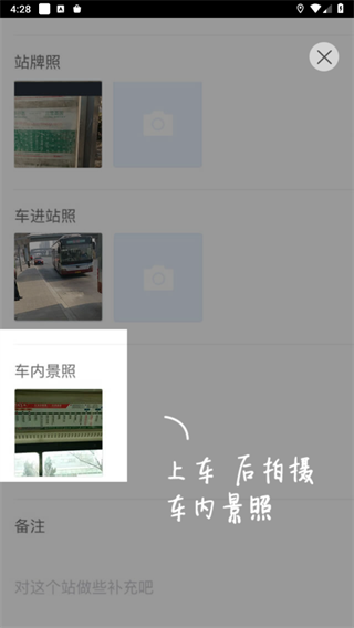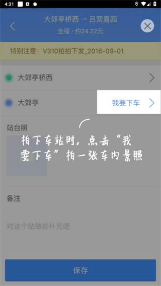 7、拍下车站时,点击“我要下车”拍一张车内景照
