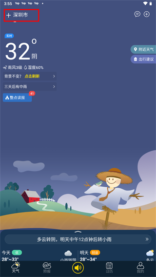 2、上下滑动可以自动语音播报,当时的天气状况、今天的天气变化情况、近15天的天气情况、日期以及近期全世界的新闻资讯