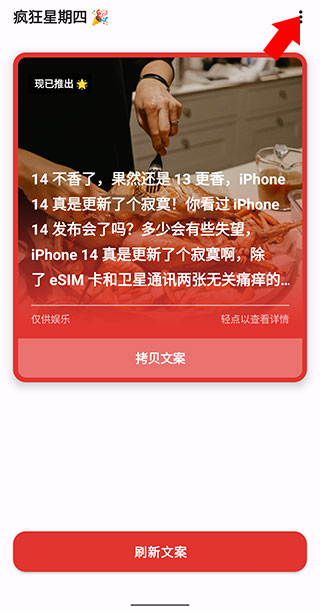 1、下载并打开疯狂星期四文案生成器,点击右上角点状按钮