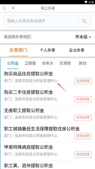 1、打开APP进入服务-->网上办事-->在线办理,在热点事项下点击“购买商品住房提取公积金”