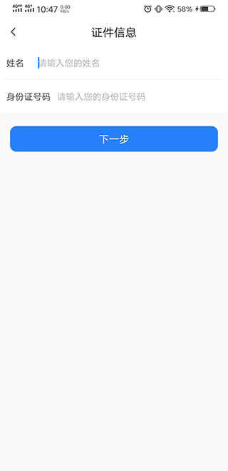 7、“证件信息”界面输入需要认证人员的姓名、身份证号码后点击“下一步”按钮。