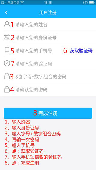 3、按照图中红色数字的顺序注册,部分操作者年龄偏大,而且手机验证码时效只有一分钟,所以最后选择获取验证码