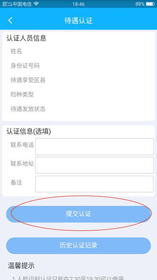 1、注册成功后,在主界面找到点击:待遇认证再选择本人认证