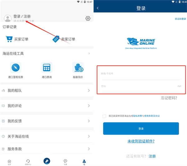 1、在本站下载安装好海运在线app后,点击页面右下角“我”在头像旁边找到“登录/注册”按钮进入,输入手机号与验证码即可完成注册。