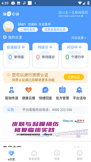4、登录进软件后点击立即认证,提交医师资格证等信息即可开始网上接诊了