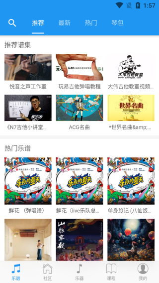用户可以在乐谱板块中查阅众多吉他乐谱进行学习,也可以根据推荐、最新、热门、琴包挑选乐谱