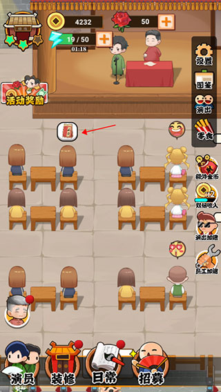1、下载后打开进入游戏,首先我们需要给相声茶馆添置座椅等一系列设备